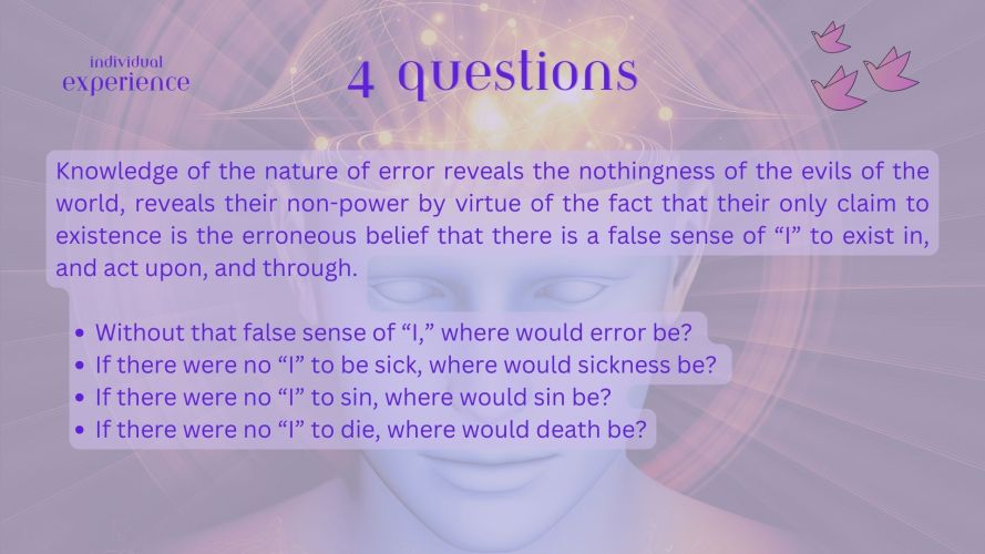 Why do you confirm your mis-identity so many times a day? What happens if you don’t do that? Is it a sacrifice to give up your false sense? Did it bring you a lot of good? In the meeting we had we used this sheet with four questions take a look at it if you want. These questions were asked by Joel Goldsmith, directly from the book. He uses the “If” form to demonstrate the falsity of your perception of a world of limitation.